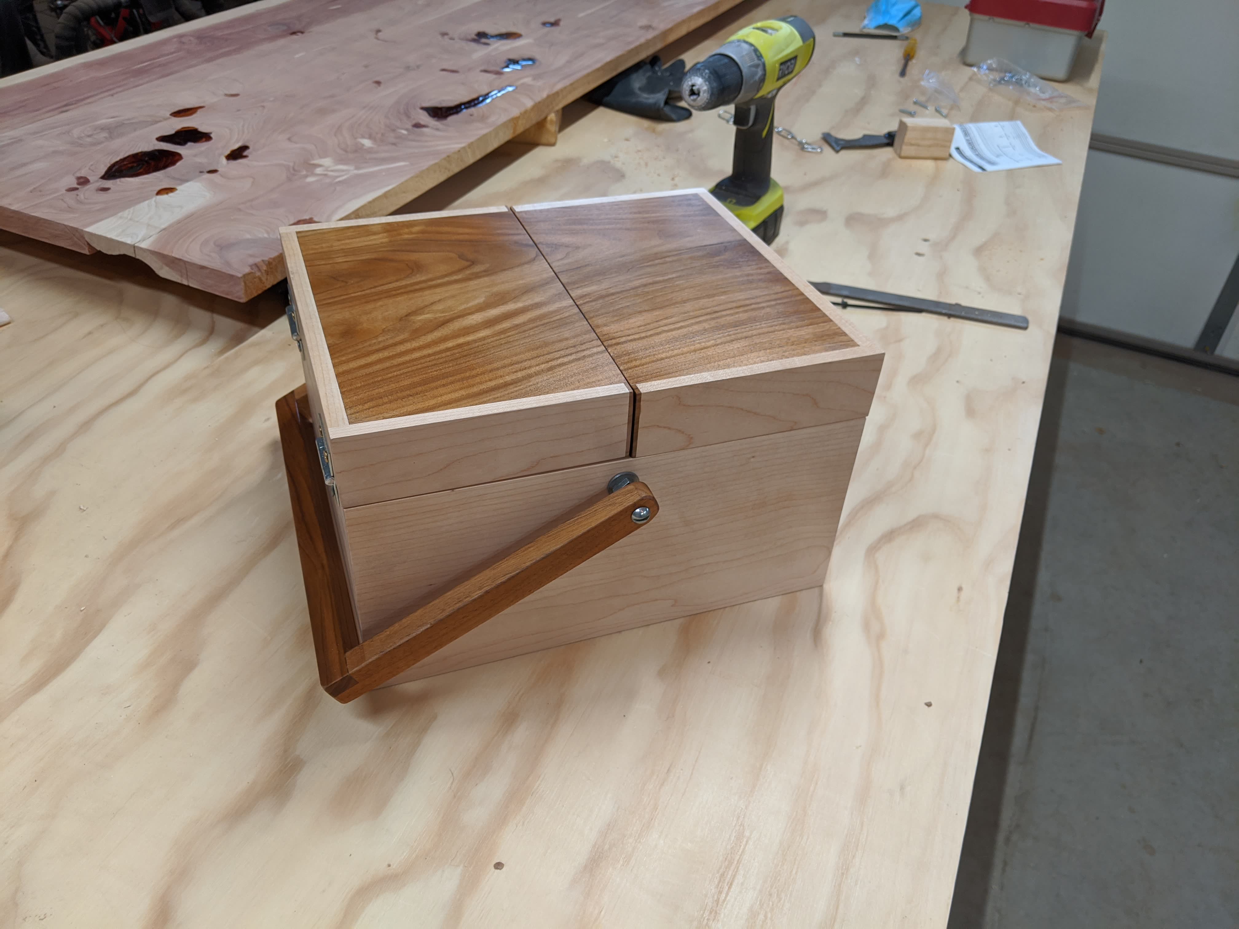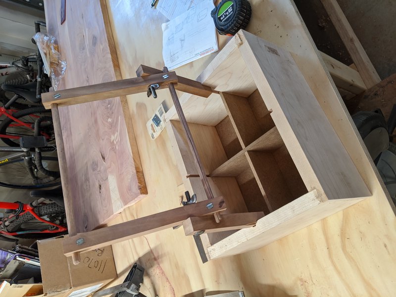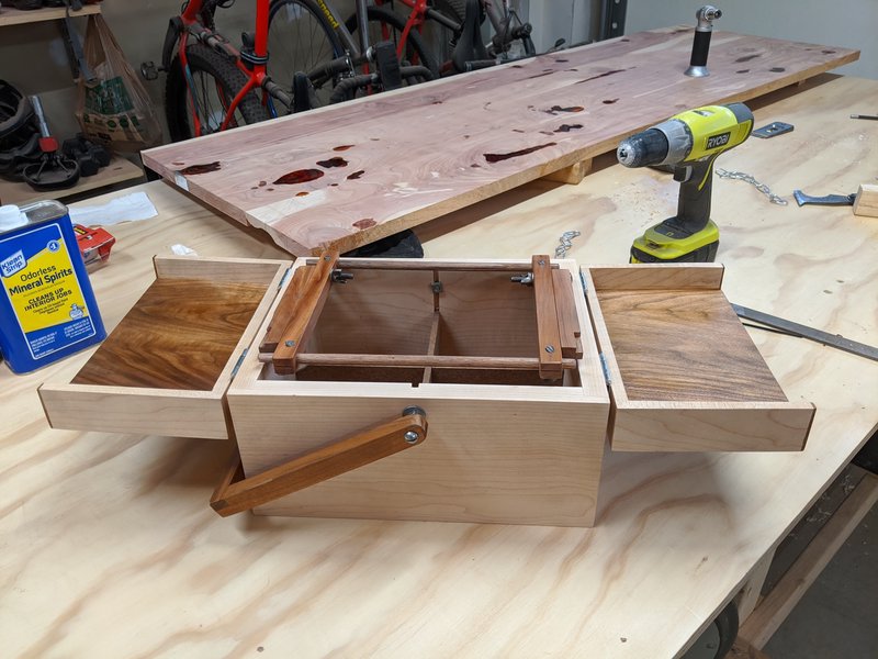 After that, came the top and handle. I had a single board of walnut with a usable pice that was just wide enough to use for the top. It wasn’t quite wide enough to cover the whole thing, which is why there’s maple sides on the top. These also give the top just enough clearance to store the frame when it’s folded flat.