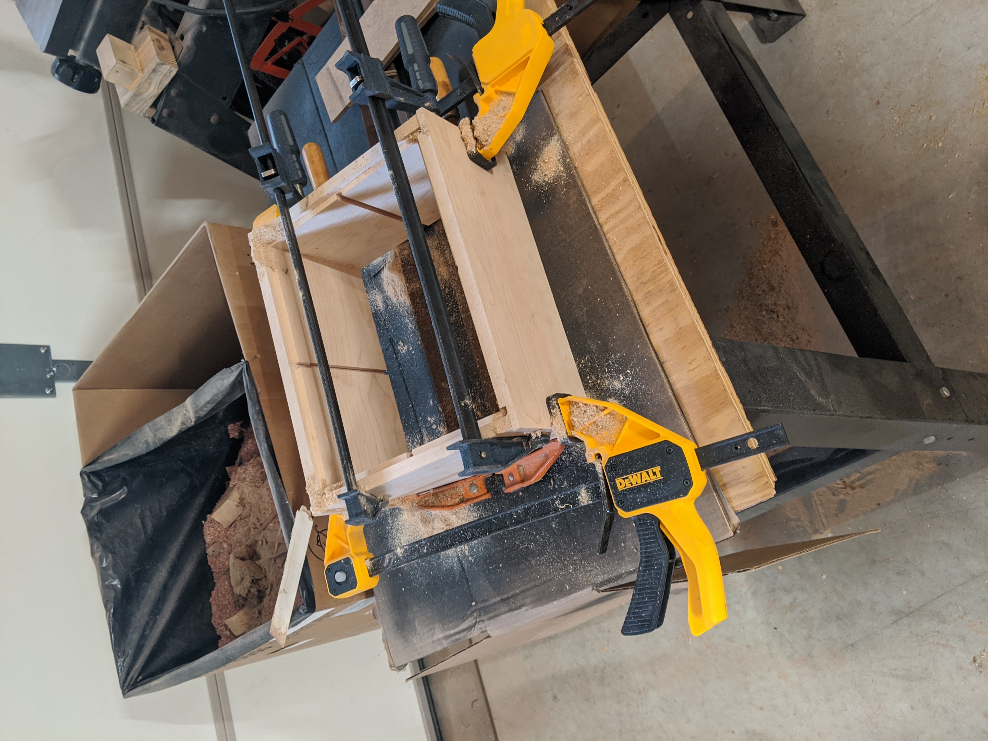 - Glued together, poorly. I should have used a square clamped to the inside to make sure the box turned out square. The sawdust was to make glue cleanup easier.
