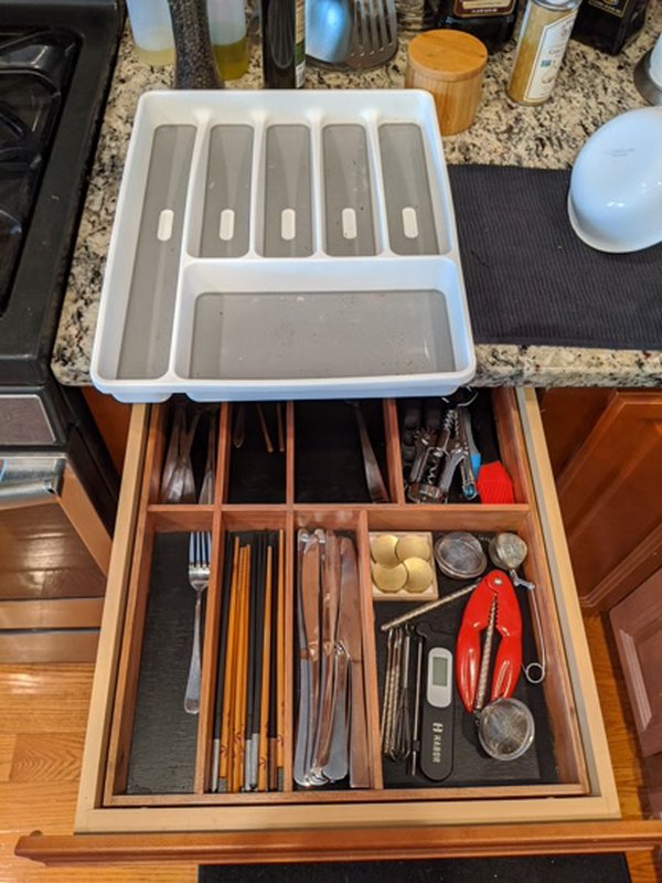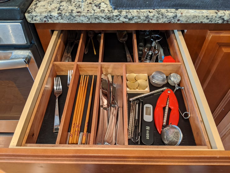 I started with a piece of oak recovered from a bed frame I found next to a dumpster. I think it was originally one of the posts. I cut it up into thin strips, which could then be used as the dividers. The strips were mostly usable, but there were definitely noticable screw holes, etc. Since all the outer sides of this piece are hidden (it sits inside a drawer), it wasn’t too hard to hide them.