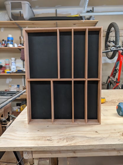 I had a piece of 1/4" scrap MDF big enough to use for the base, which I cut oversized. Raw MDF doesn’t look great on its own, so I painted it black. After that I glued all the divider pieces down, starting from the outside and working my way in. Edges first (being careful to keep it square), then I could cut all the dividers to final length. The dividers that cross each other each have a slot cutout where they overlap, so they both sit flush and easily stayed aligned whlie gluing.