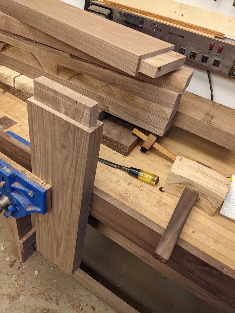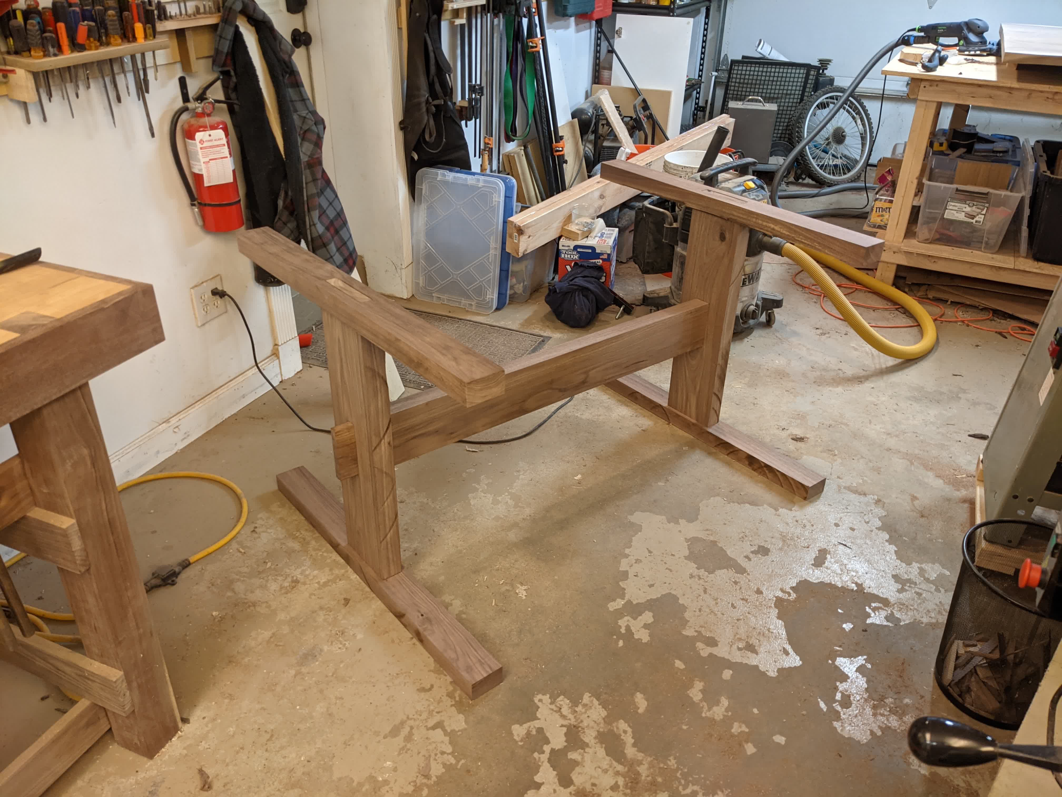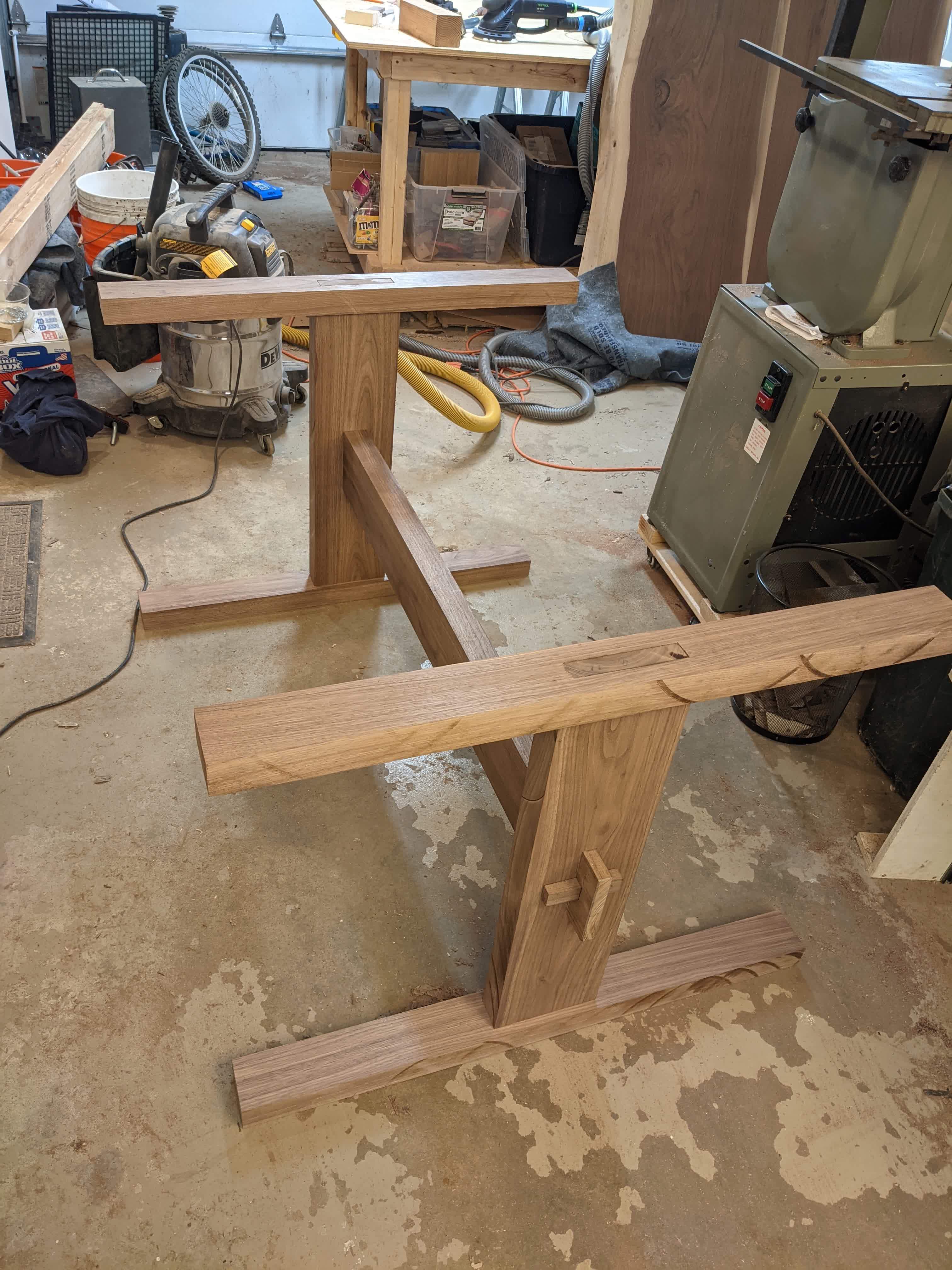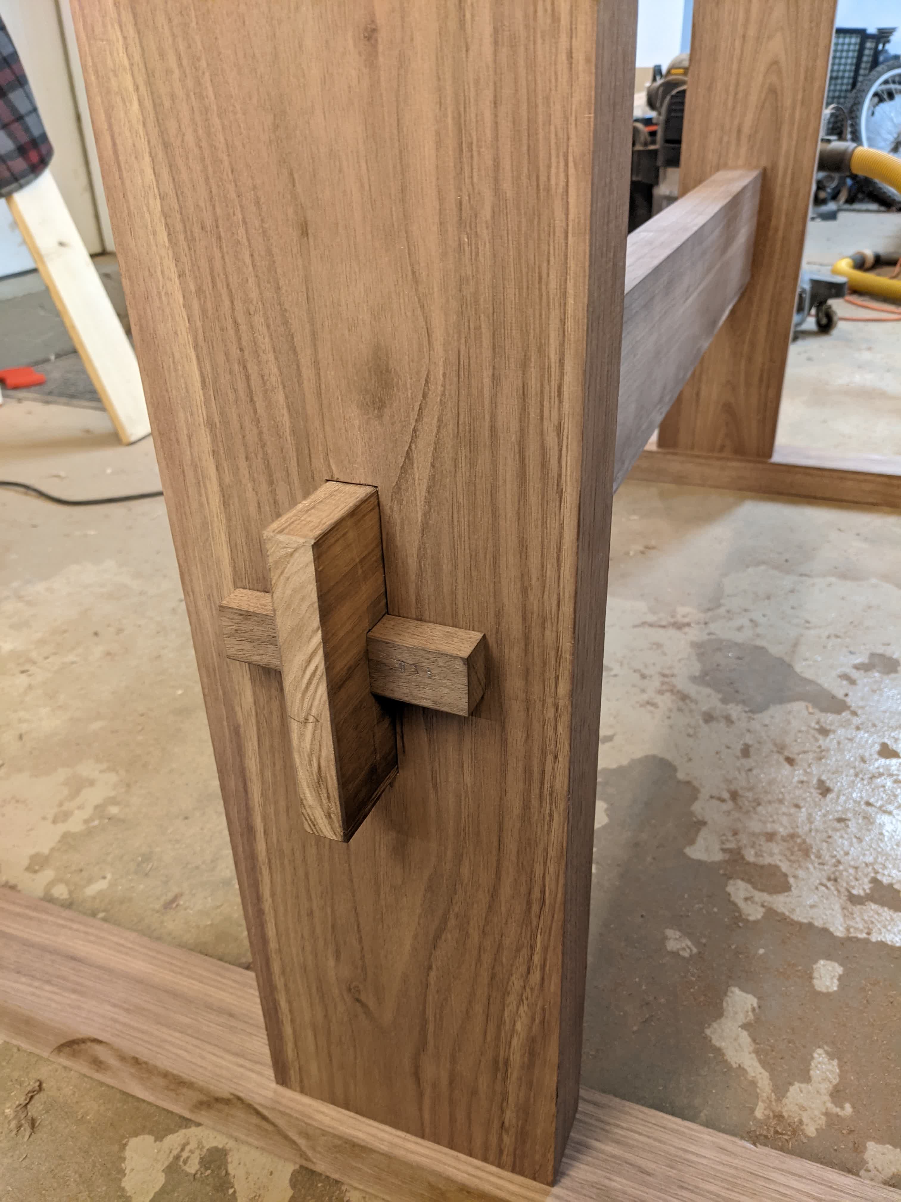 Then to start the base. Everything on the base is designed using huge mortise / tenon joints, and the stretcher in the middle will hold in place just using friction + a wedge on either end (“tusks”). That way, if (when) I need to move it, the entire base will flatten without even needing screws to come out.