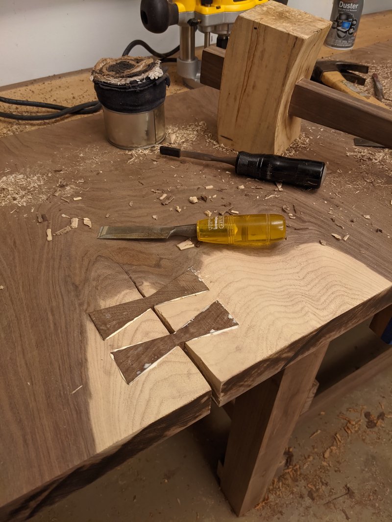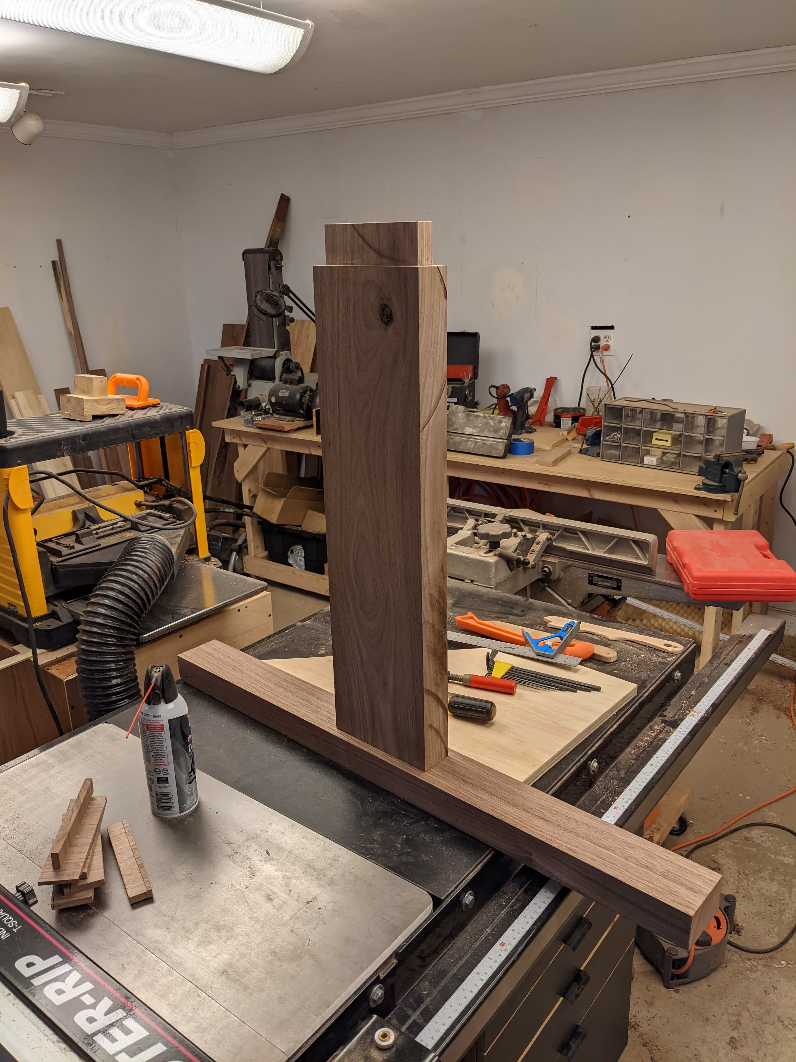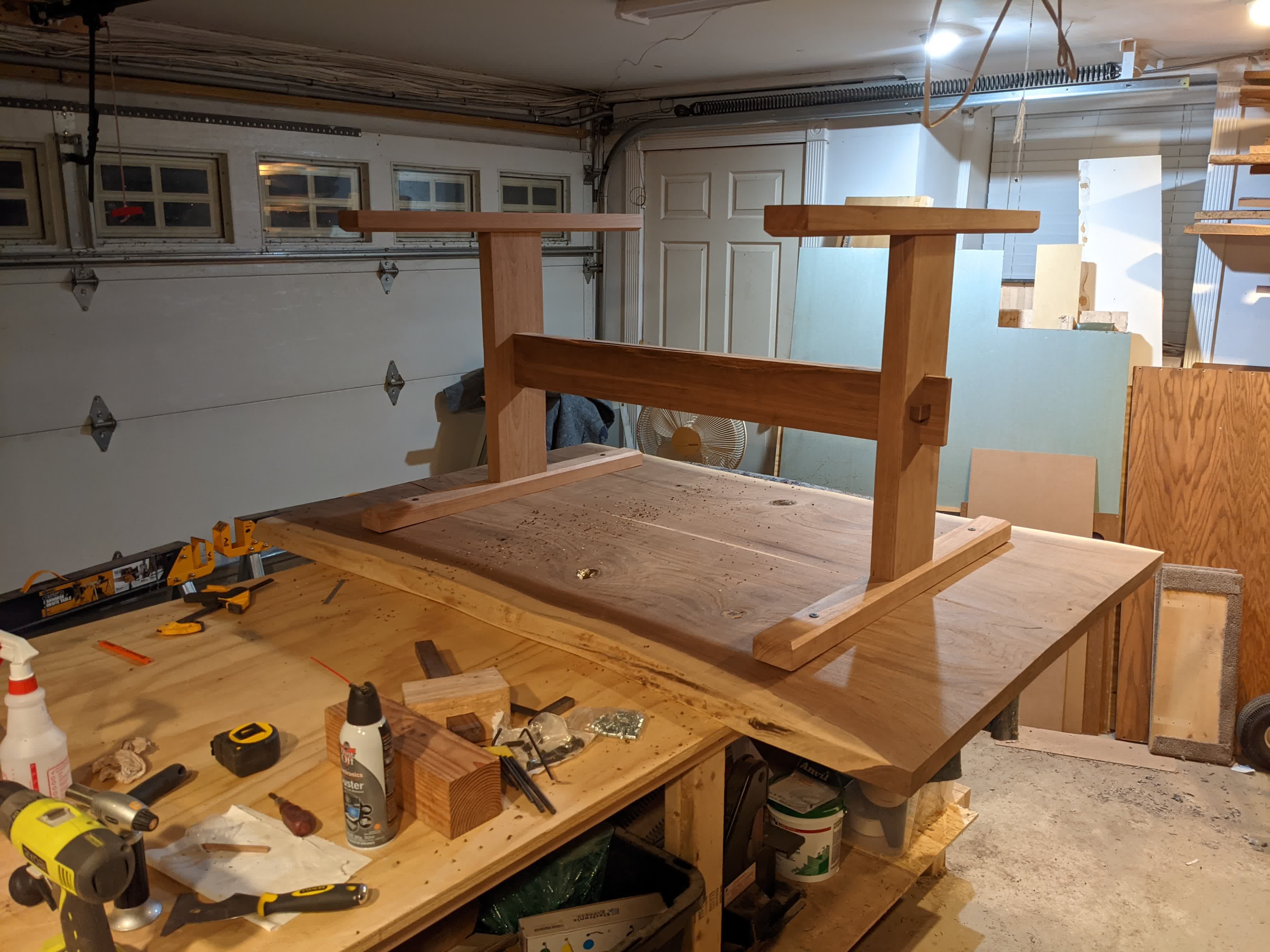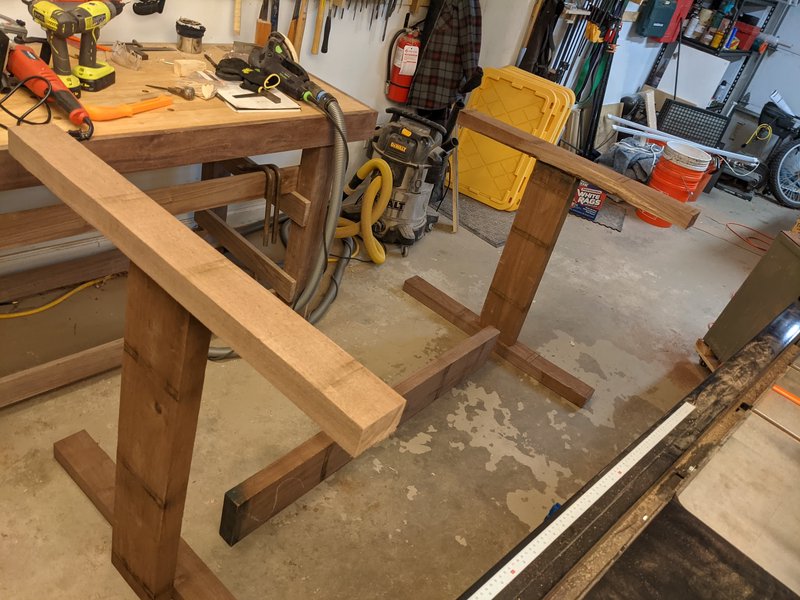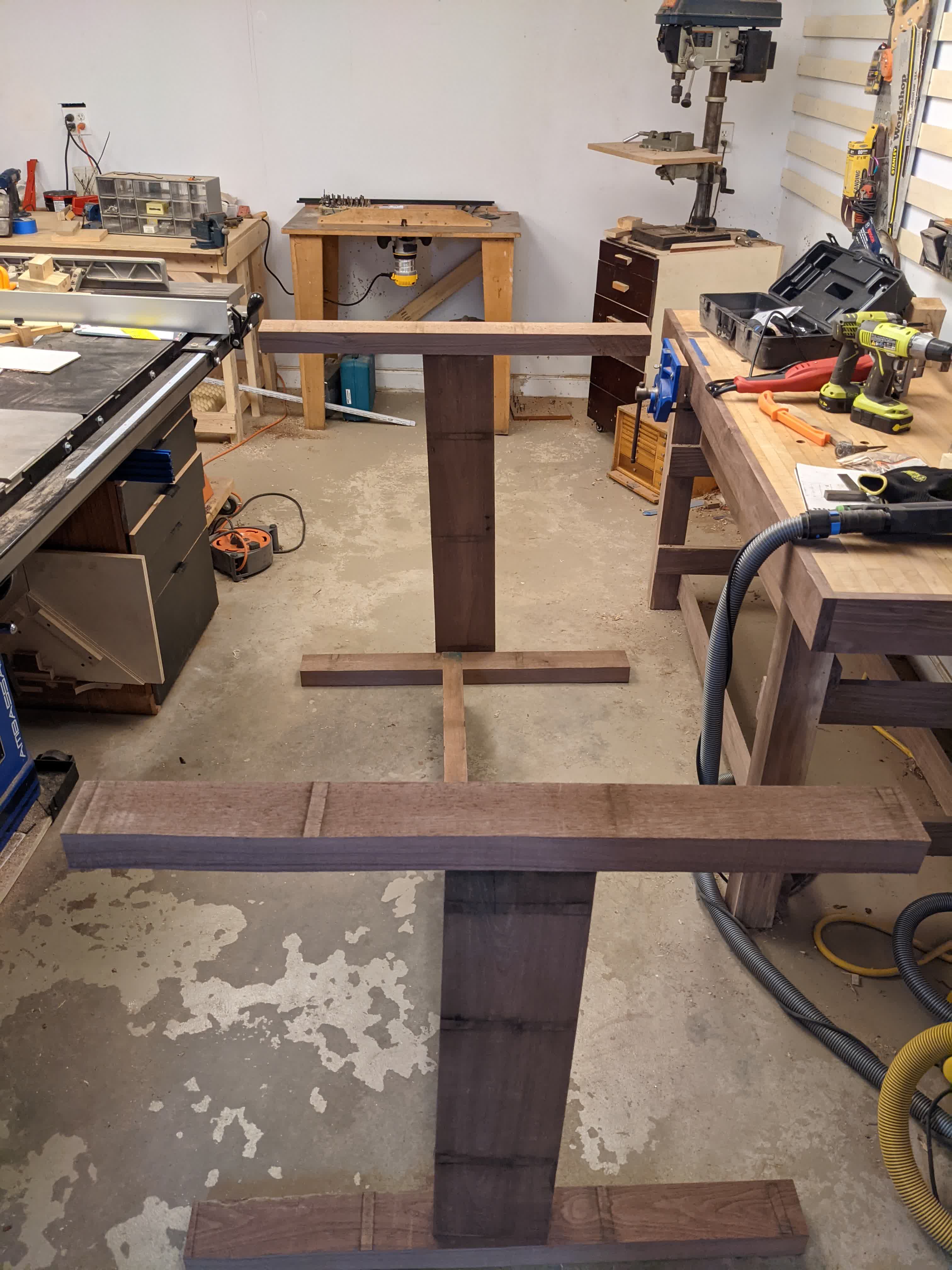 Then to start the base. Everything on the base is designed using huge mortise / tenon joints, and the stretcher in the middle will hold in place just using friction + a wedge on either end (“tusks”). That way, if (when) I need to move it, the entire base will flatten without even needing screws to come out.